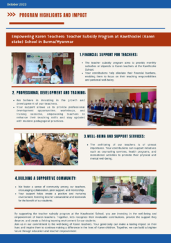 On behalf of the Karen Education and Culture Department (KECD) and Karen Teachers Working Group (KTWG), we are excited to share some wonderful news with you. We are thrilled to provide an update on our Teacher Subsidy Program, which focuses on supporting Karen teachers in Kawthoolei (Karen State).
